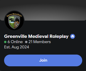 Welcome to Greenville Medieval Roleplay We are a new Greenville Roleplay server, As we made the server a couple of hours ago sessions will not start until 100 members, Staff applications will be opened on 50 members, We are very active and school will not affect me, as the owner I will never stop doing sessions and do any work I will always be talking to people thru chat and Might even do a game night at 20 or 30 members, Thank you for joining!! server link (if something is wrong with it please ping me